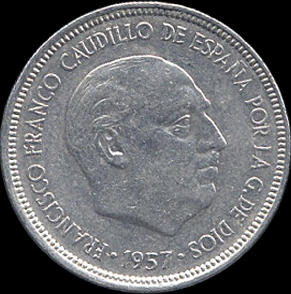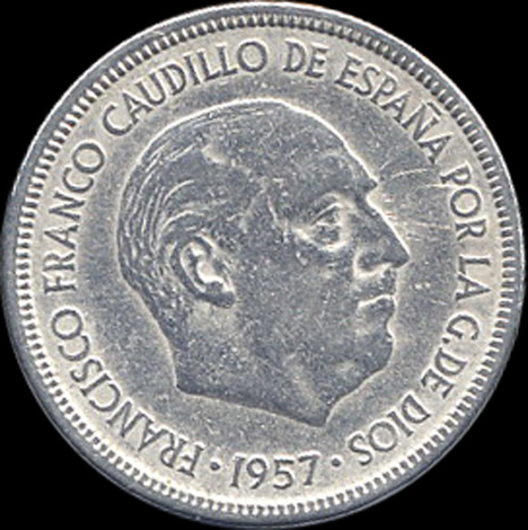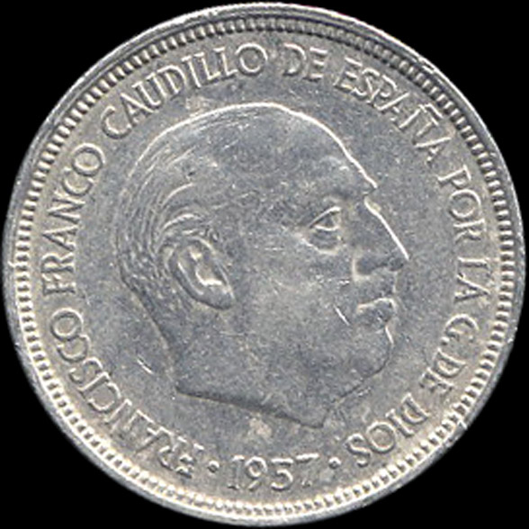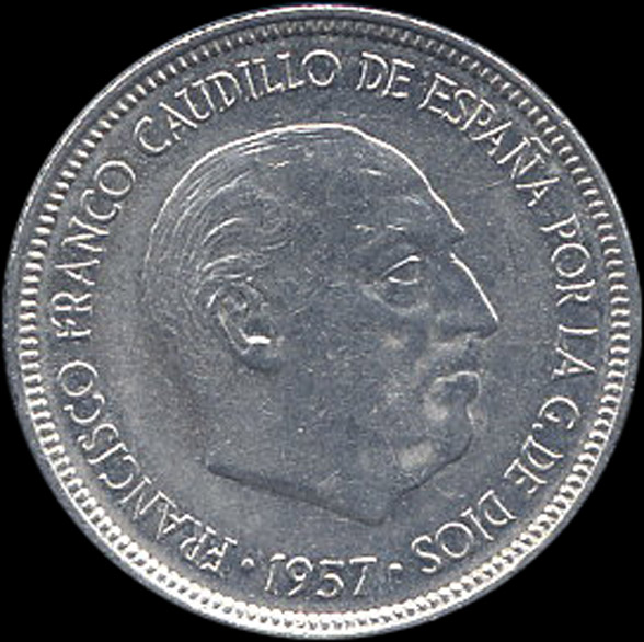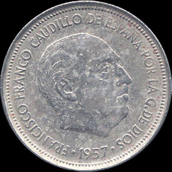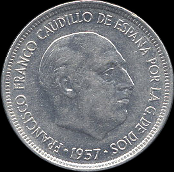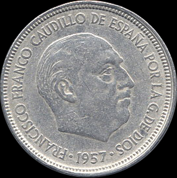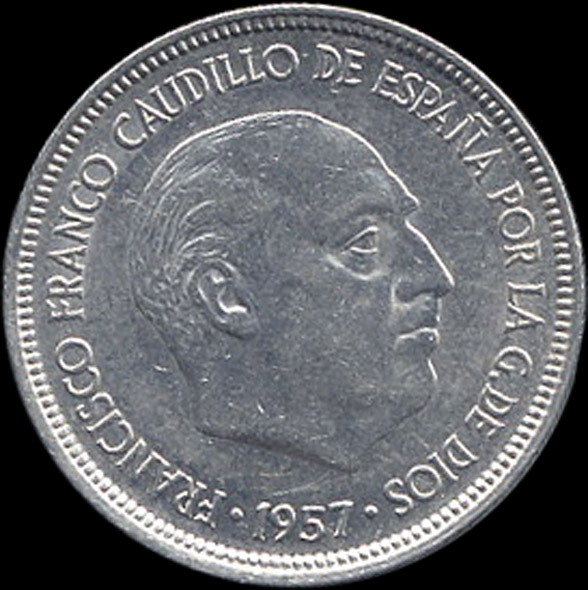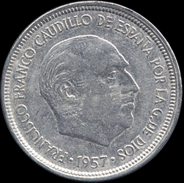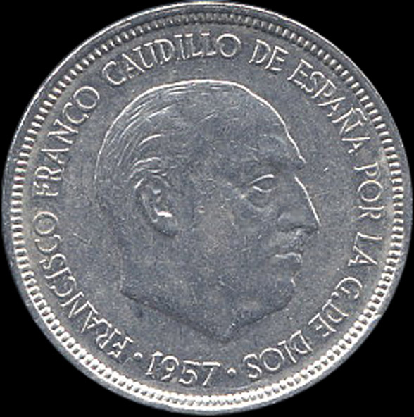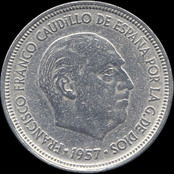 | C.01.25 | FRANCO | 5 Pesetas | 1957 | *58* | Níquel | 5,70gr | 5,722gr | 23,21mm. |