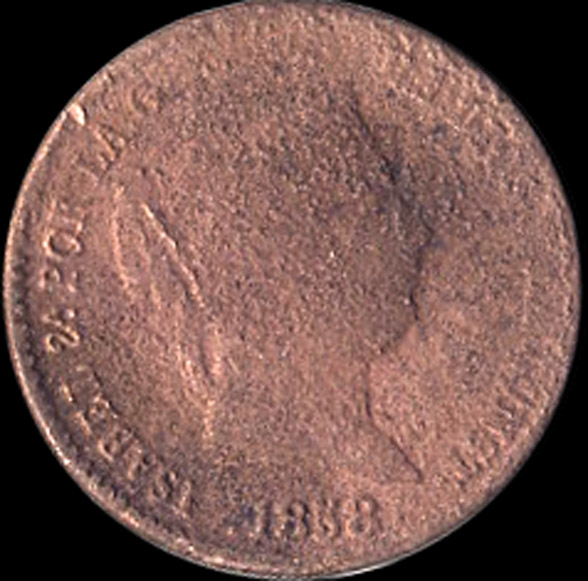 | A.01.25 | ISABEL II | 10 Céntimos de Real | 1858 | Segovia | Cobre | 3,50gr | 3,363gr | 20,03 mm. |