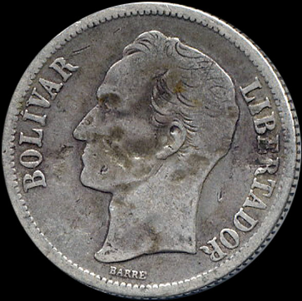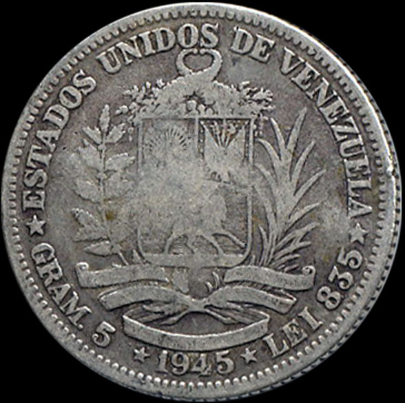 | P.10.15 | VENEZUELA | 1 Bolivar | 1945 | BARRE | Plata 835mls. | 5,00gr | 4,854gr | 22,84 mm. |