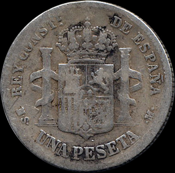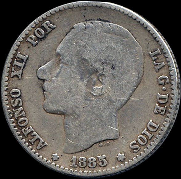 | P.10.05 | Alfonso XII | 1 Peseta | 1885 18*85 | MS M | Plata 835mls | 5,00gr | 4,643gr | 22,97 mm. |