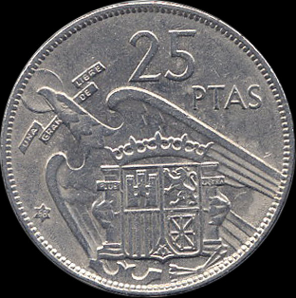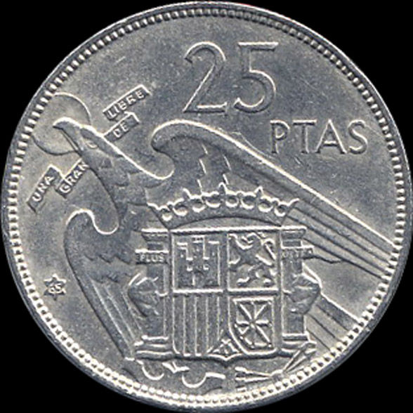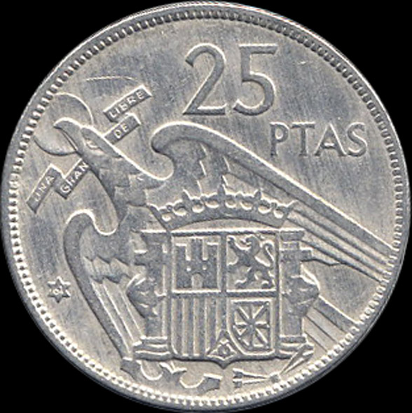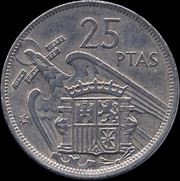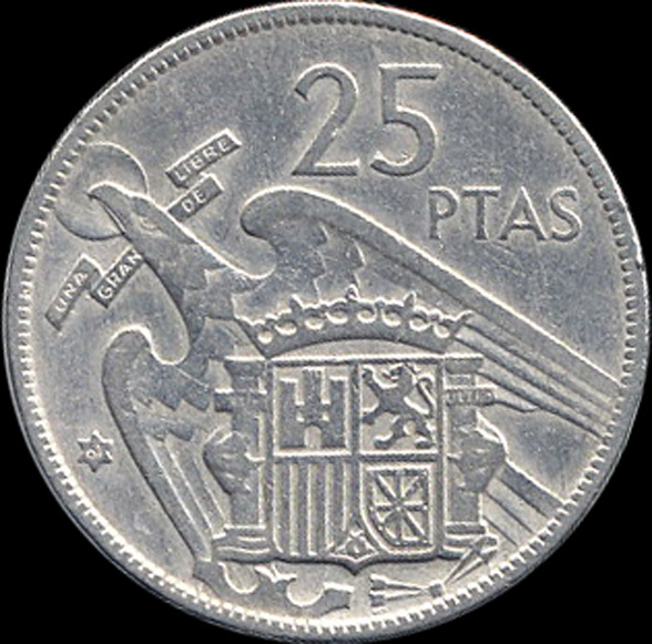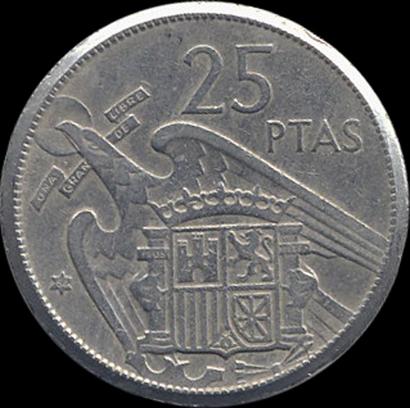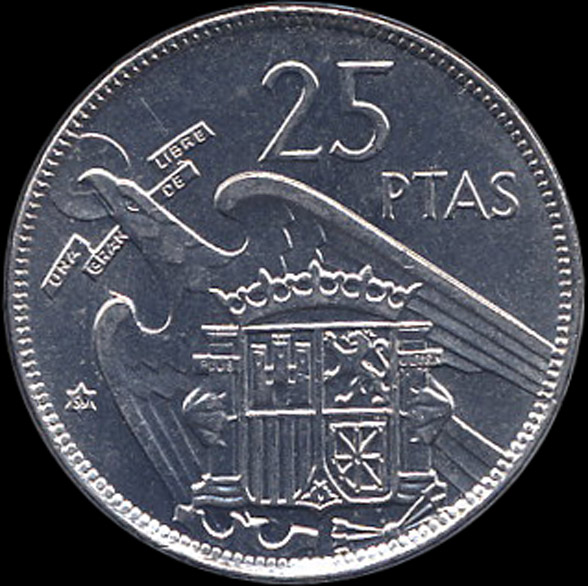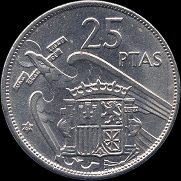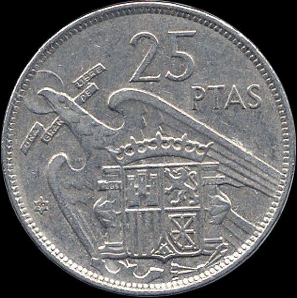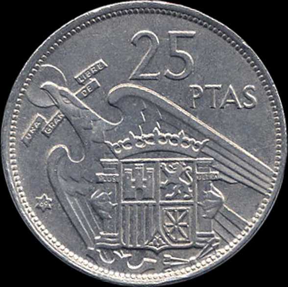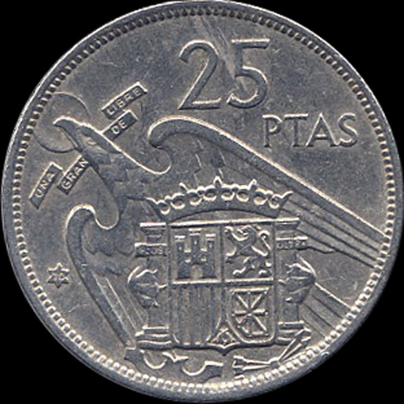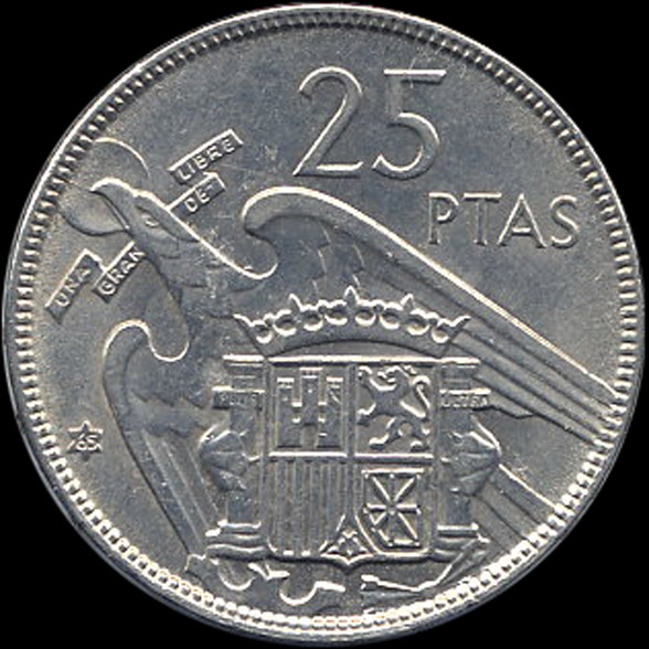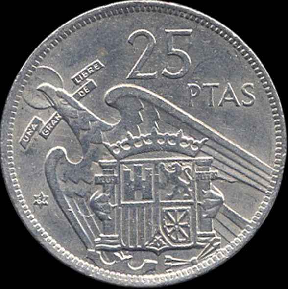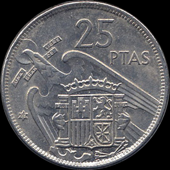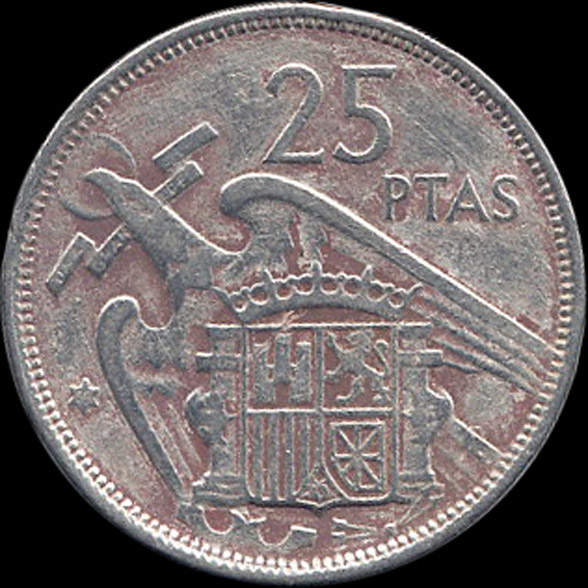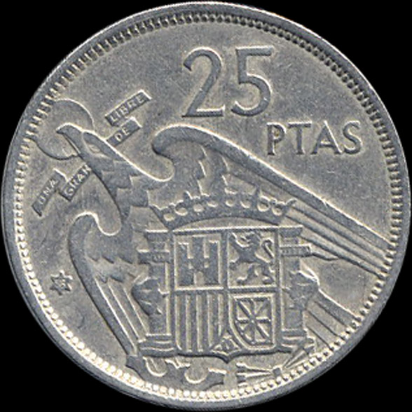 | D.10.19-D.11.01 | FRANCO | 25 Pesetas | 1957 | *65* | Níquel | 8,50gr | 8,636gr | 26,77mm. |