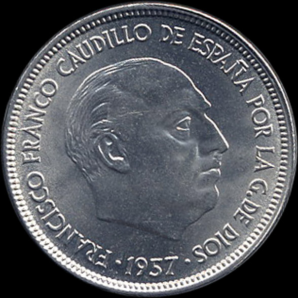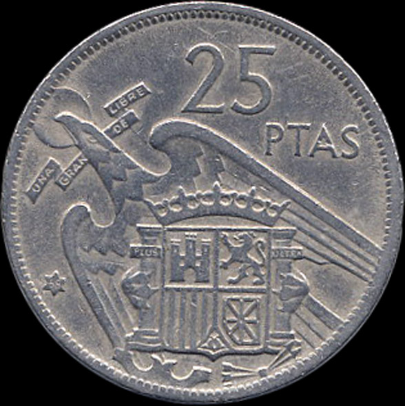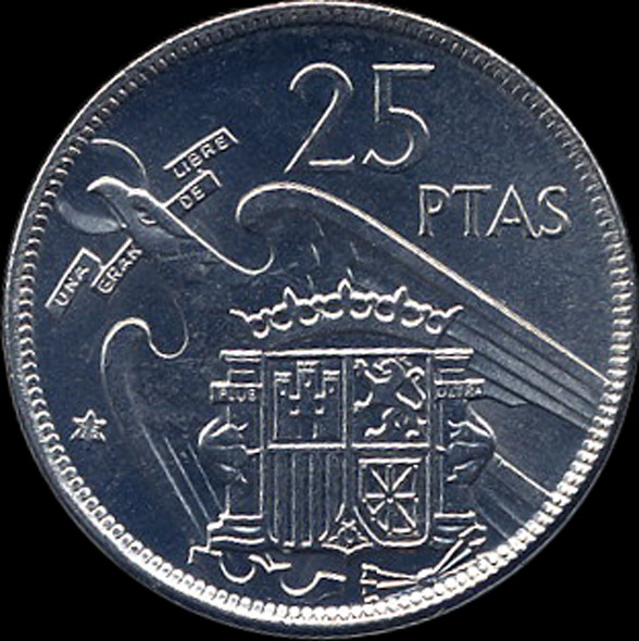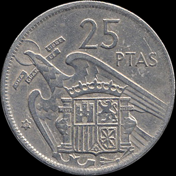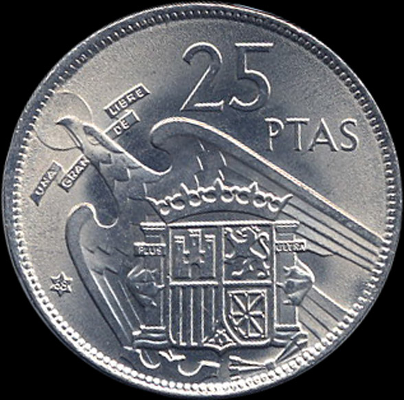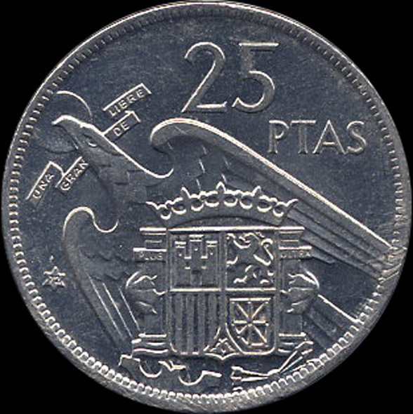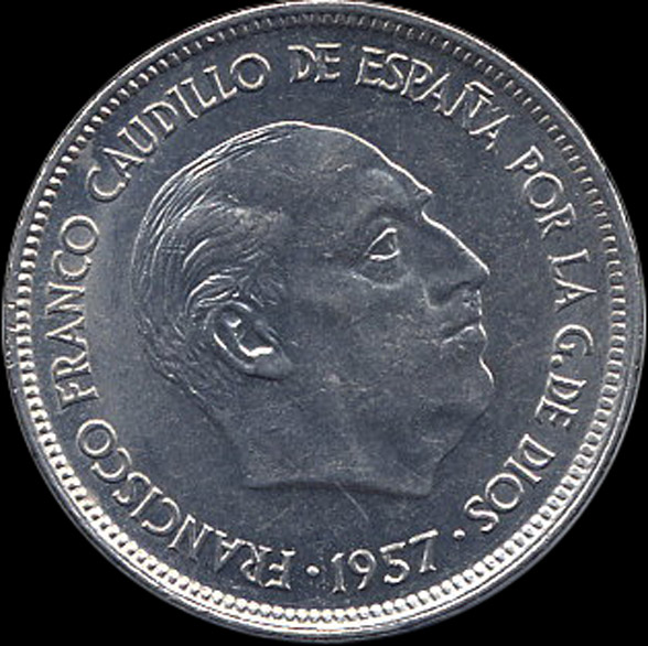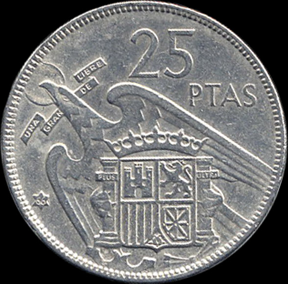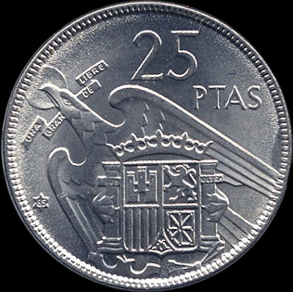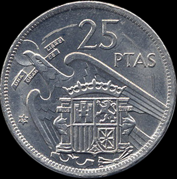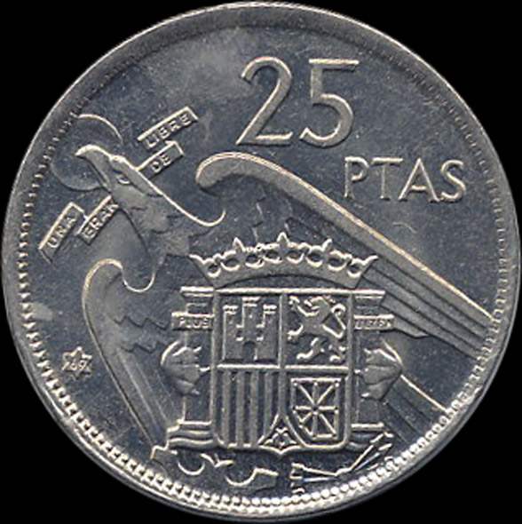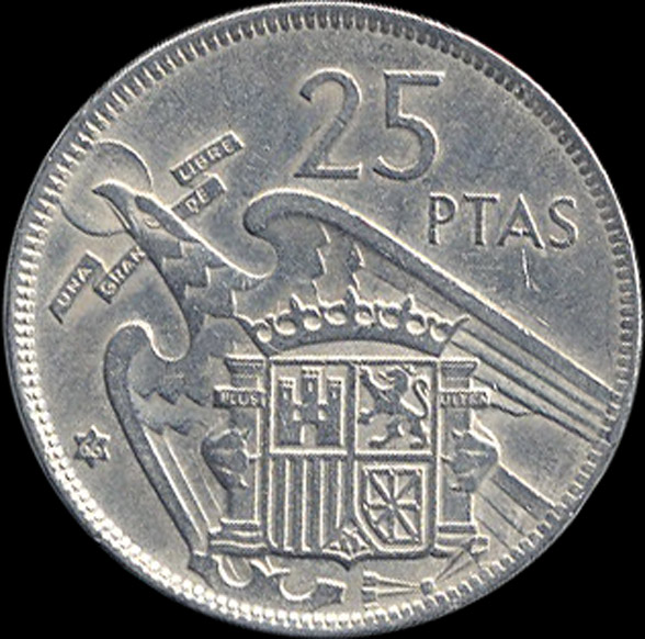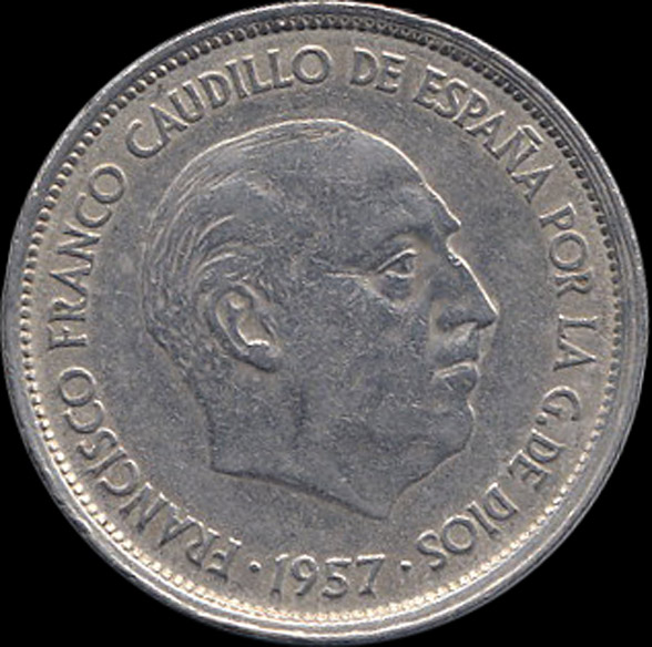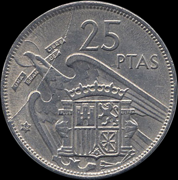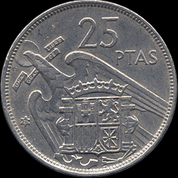 | D.10.19-D.11.01 | FRANCO | 25 Pesetas | 1957 | *65* | Níquel | 8,50gr | 8,636gr | 26,77mm. |