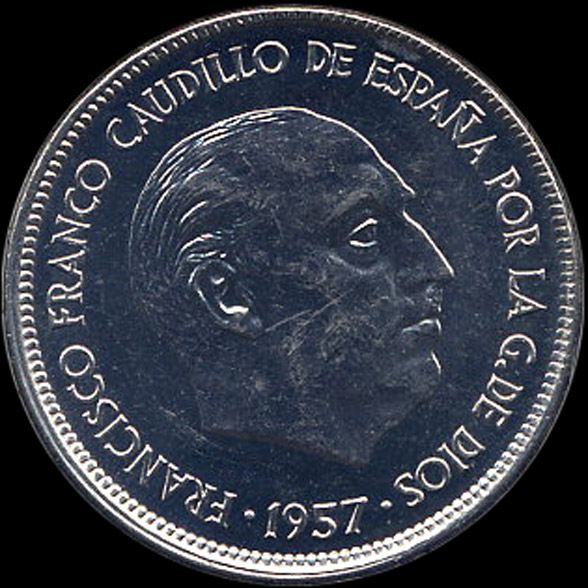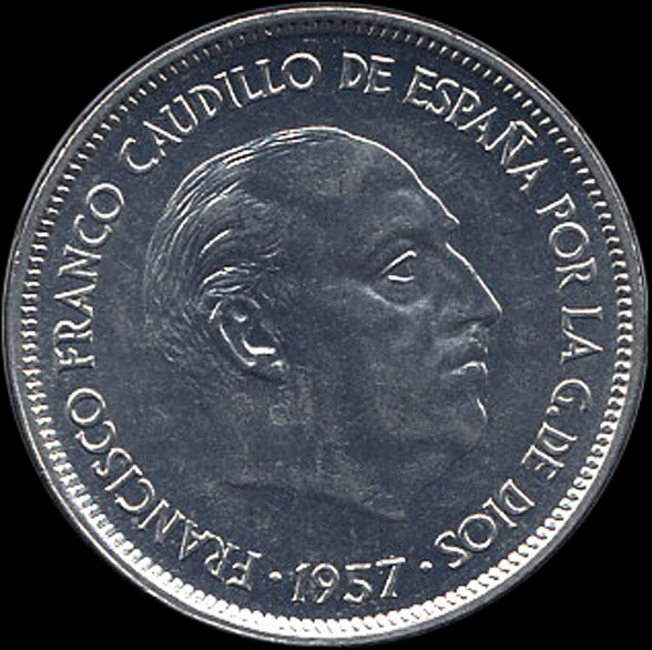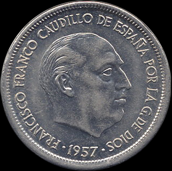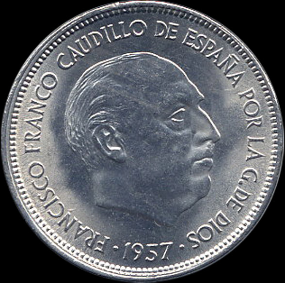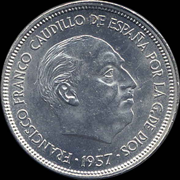 | E.01.01-03 | FRANCO | 25 Pesetas | 1957 | *68* | Níquel | 8,50gr | 8,581gr | 26,59mm. |