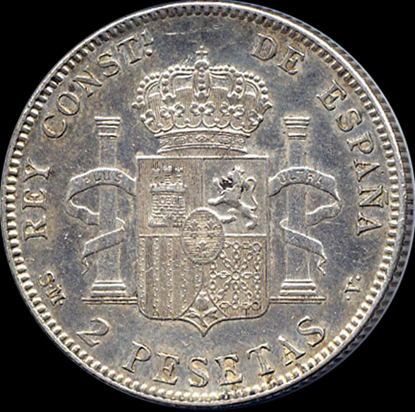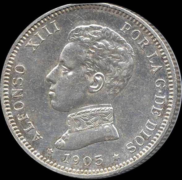 | P.09.04 | Alfonso XIII | 2 Pesetas | 1905 19*05 | SM V | Plata 835mm. | 10,00gr | 10,059gr | 27,05 mm. |