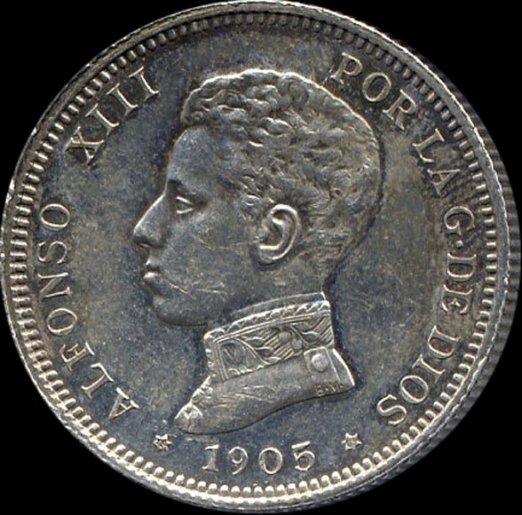 | P.09.05 | Alfonso XIII | 2 Pesetas | 1905 19*05 | SM V | Plata 835mm. | 10,00gr | 10,062gr | 27,15 mm. |