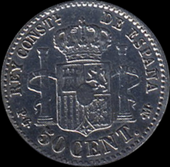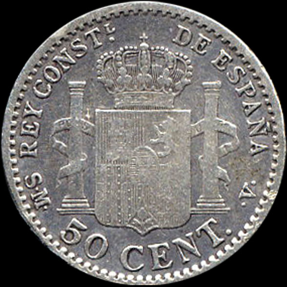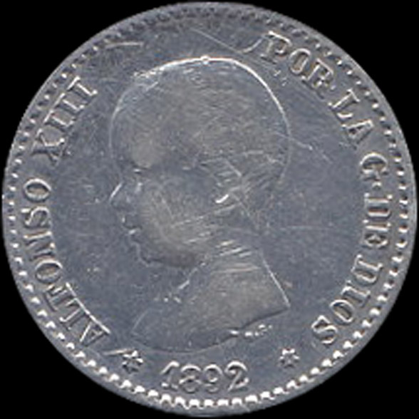 | P.11.09 | Alfonso XIII | 50 Céntimos | 1892 9*2 | PG M | Plata 835mm. | 2,50gr | 2,461gr | 18,23mm. |