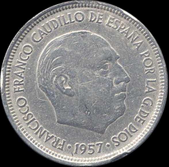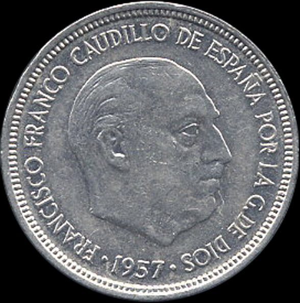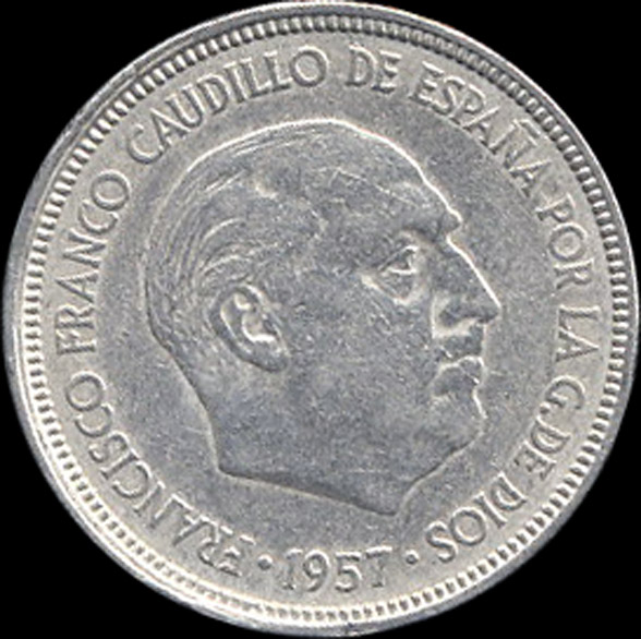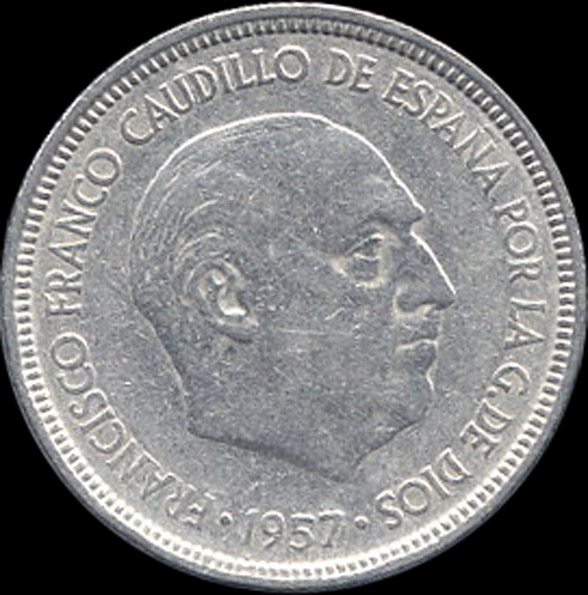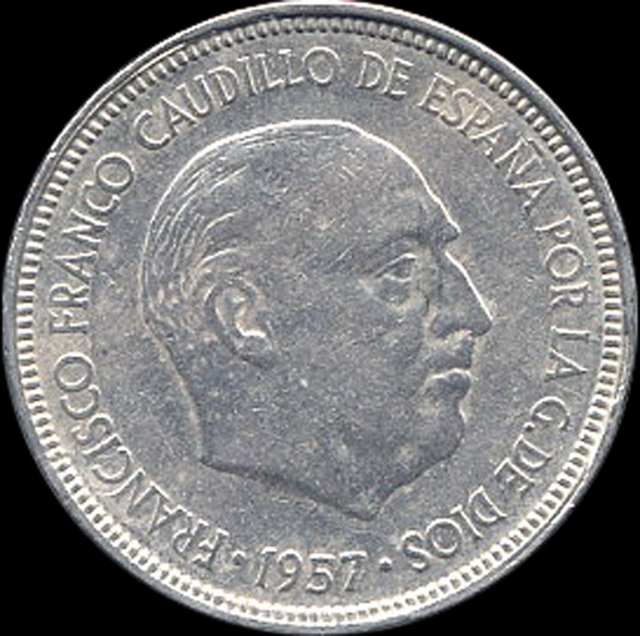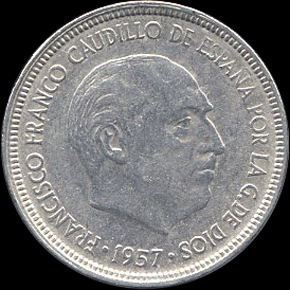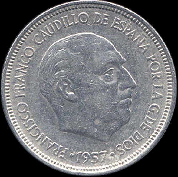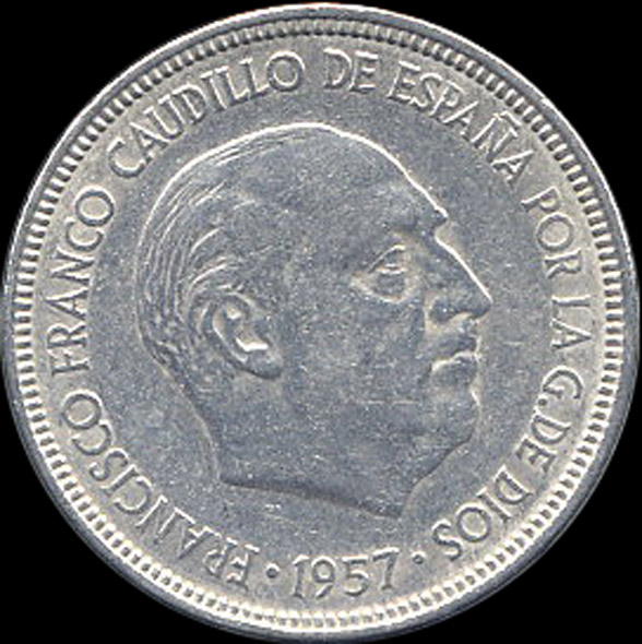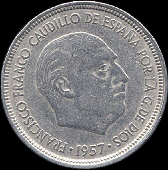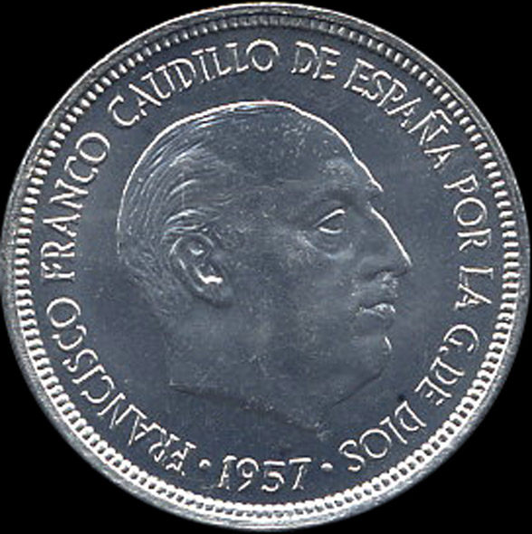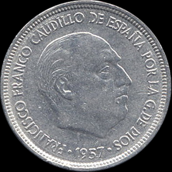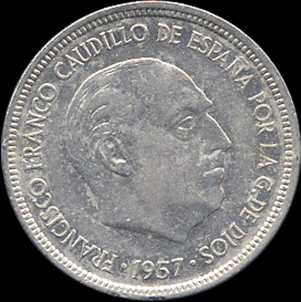 | C.01.25 | FRANCO | 5 Pesetas | 1957 | *58* | Níquel | 5,70gr | 5,722gr | 23,21mm. |