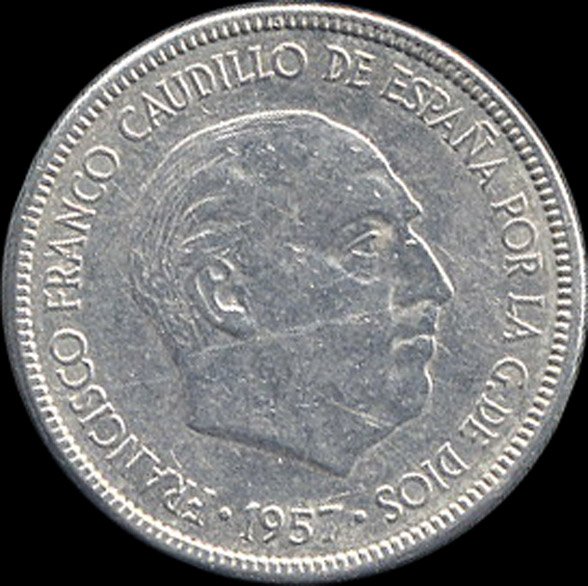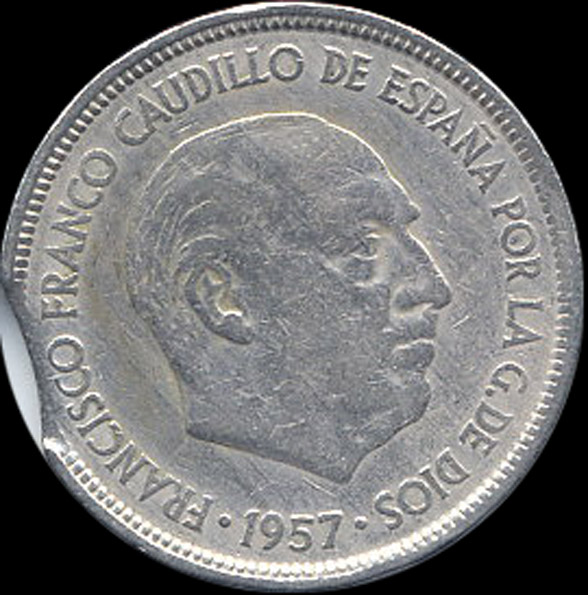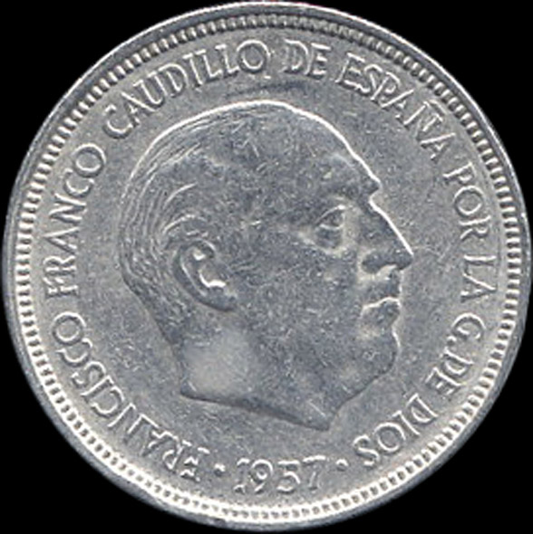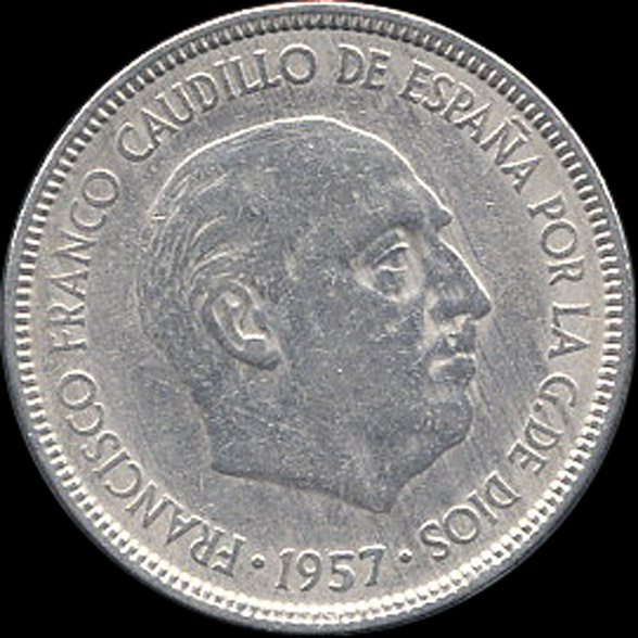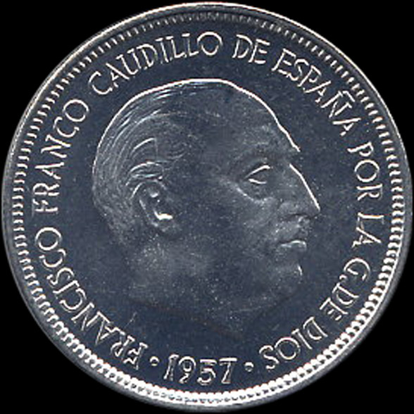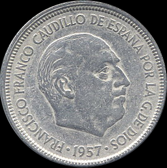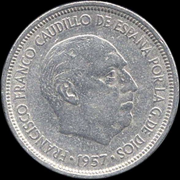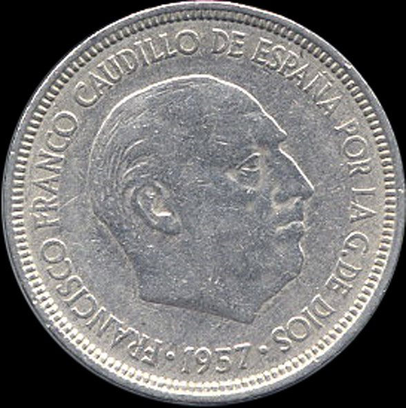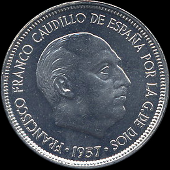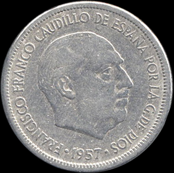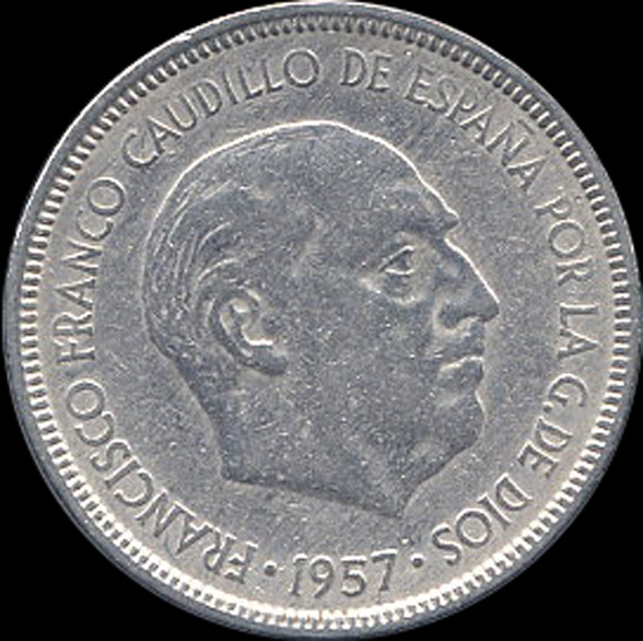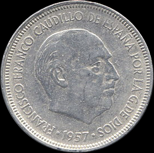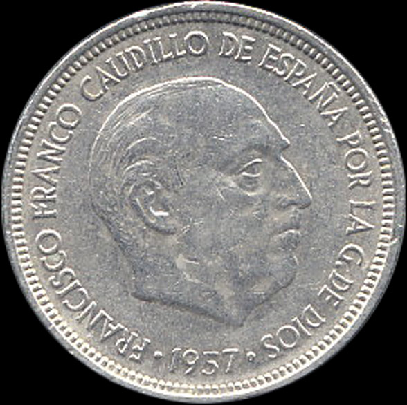 | C.01.25 | FRANCO | 5 Pesetas | 1957 | *58* | Níquel | 5,70gr | 5,722gr | 23,21mm. |