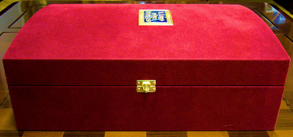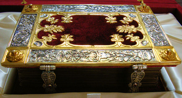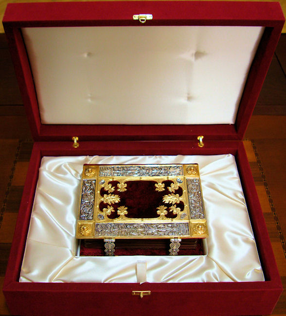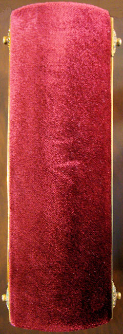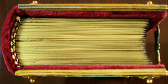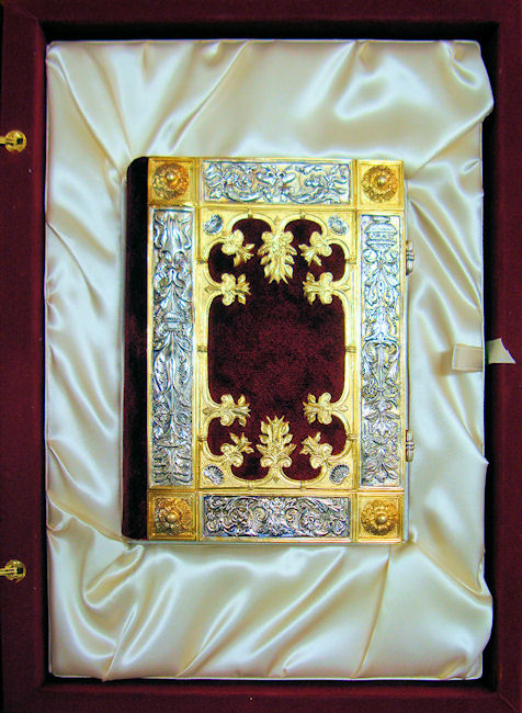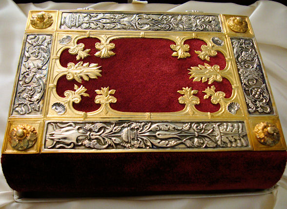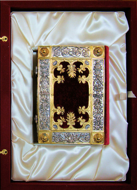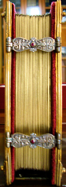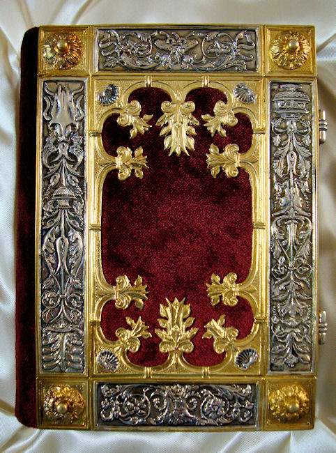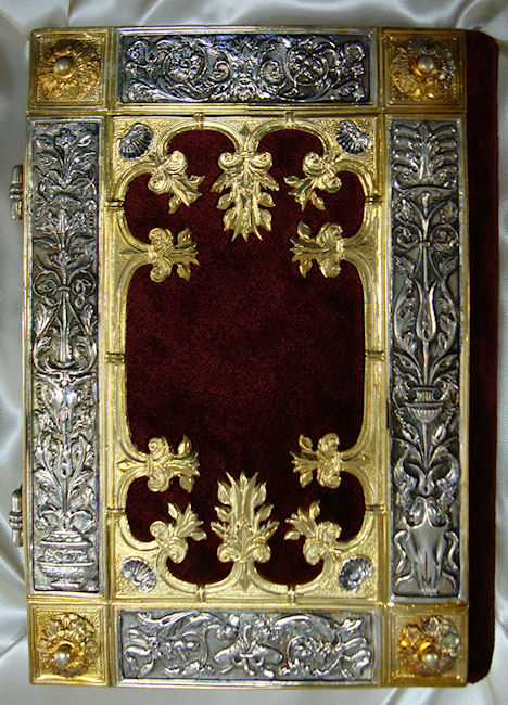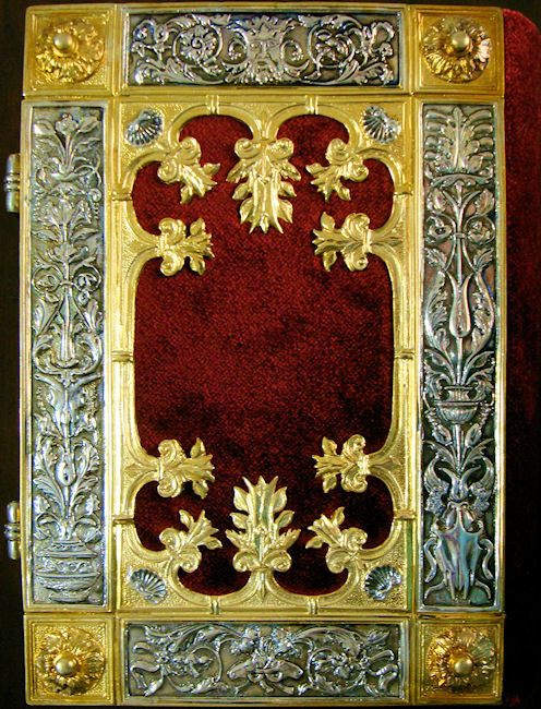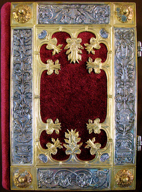 La elegante y elaborada encuadernación de plata cincelada y repujada con zonas doradas sobre fondo de terciopelo púrpura data de la misma época que el códice, compartiendo con él una decoración de gusto similar. Resulta espléndida la profusión de motivos con reminiscencias clásicas a base de palmetas, hojas de acanto, espigas, racimos de uva, jarrones, mascarones, escarabajos y bucráneos. En los cierres de plata se encuentran engastados dos pequeños rubíes.