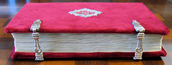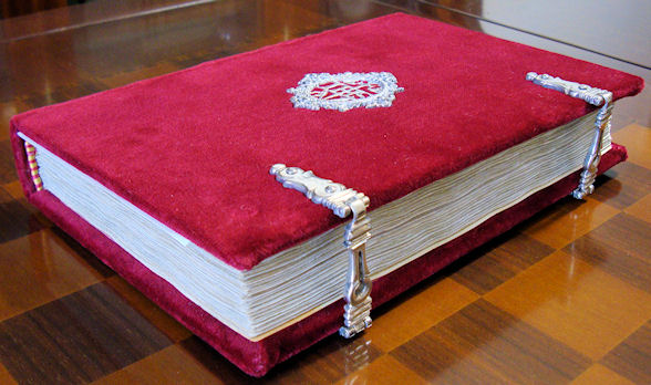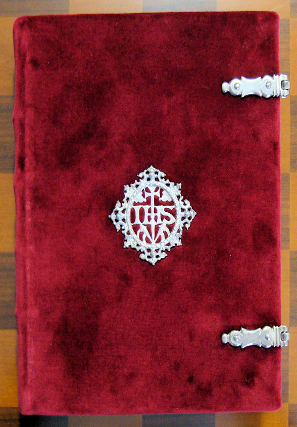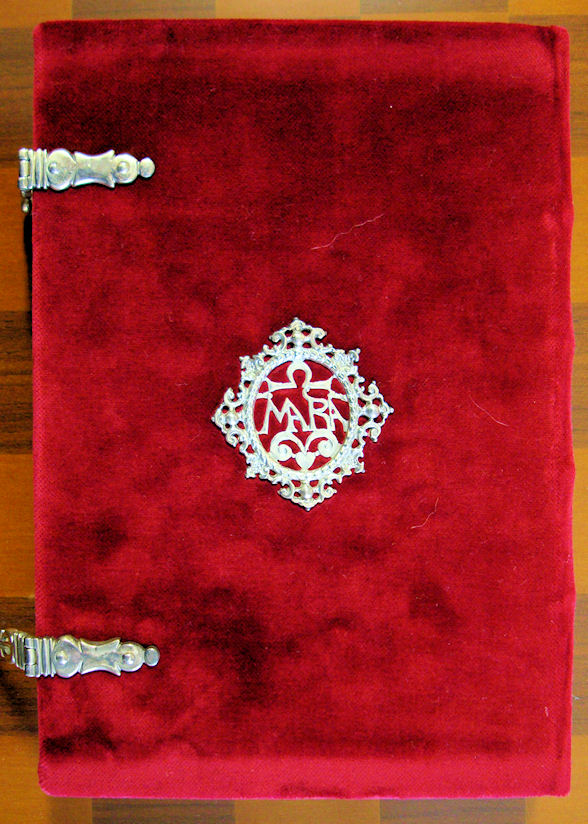Encuadernación artesanal en terciopelo rojo, con cierres y medallones de plata de ley.