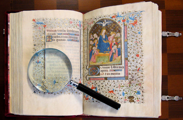Casi 400 páginas en fina vitela de 220 x 150 mm, todas ellas con preciosas orlas realzadas con oros.