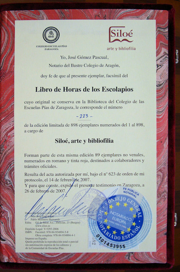 | Libro de Horas | SILOÉ | Libro de Horas de los Escolapios | 2007 | 223 | 3,8 Kg. | 289*234*115 mm. |